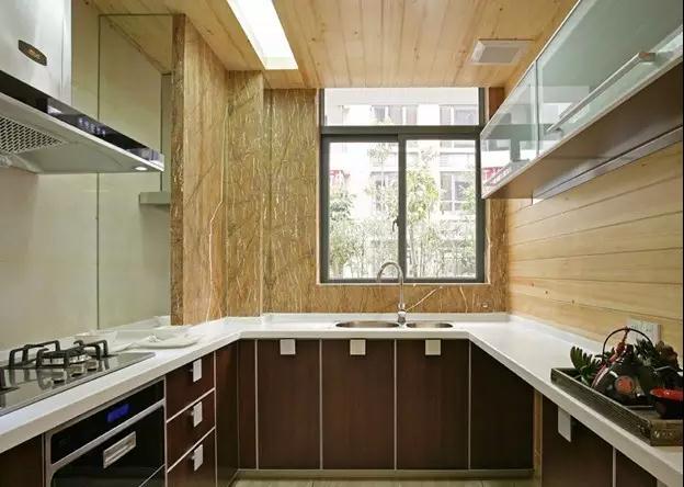 U型櫥柜設計儲物功能大,左邊吊柜統一采用開放柜與封閉柜不僅美觀,而且方便擺放和儲藏物體,棕色背景與面板形成呼應,使空間更為溫馨、自然。