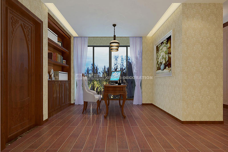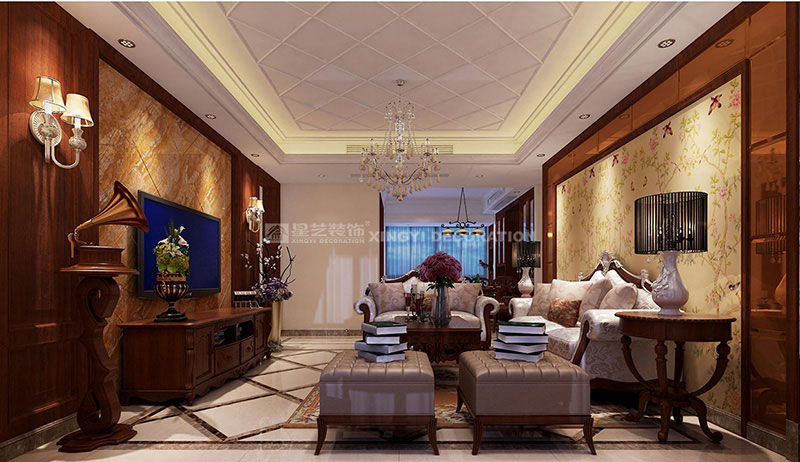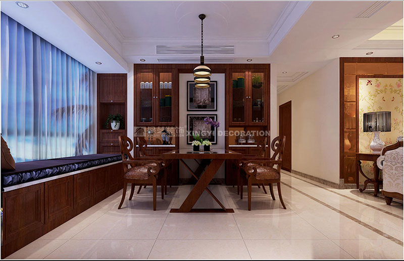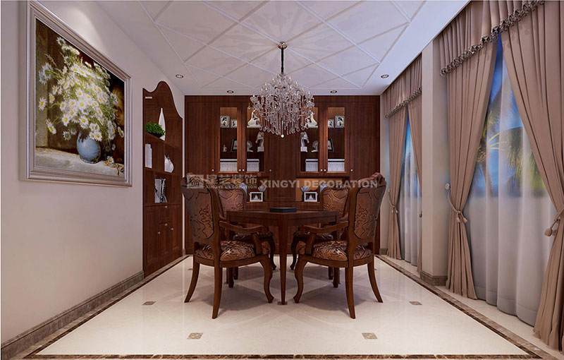 鳳景灣260平裝修設計案例說明:本案業主置業時為了考慮和小孩長時間一起居住,故意買了兩套130平米的套房連在一起裝修,功能上一套是父母居住,主人的起居室,品茶區級棋牌室定義在父母那套,而廚房的中西廚,還有餐廳空間在小孩居住這邊。風格定義為英倫風格,它體現出的是一種典雅莊重,兼具紳士風度的住宅空間,業主的傳統素養,嚴謹的做派在此套住宅中得到了完美的詮釋。步入室內。一條主線貫穿玄關,廚房,餐廳,客廳。深色木墻與米黃色皮革軟包相互搭配,咖啡色系的花紋布藝,沙發,沙發底部地毯豐富了室內的生活氣息,沉穩而不古板。