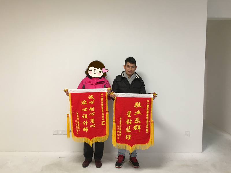 2018年12月11日,廣西工業(yè)職業(yè)技術(shù)學(xué)院曾老師送來錦旗兩幅,贊揚星藝裝飾項目監(jiān)理梁敬樂,設(shè)計師陳略、朱曉麗,錦旗內(nèi)容誠心 耐心 用心 貼心設(shè)計師,敬業(yè)樂群,星鉆監(jiān)理。