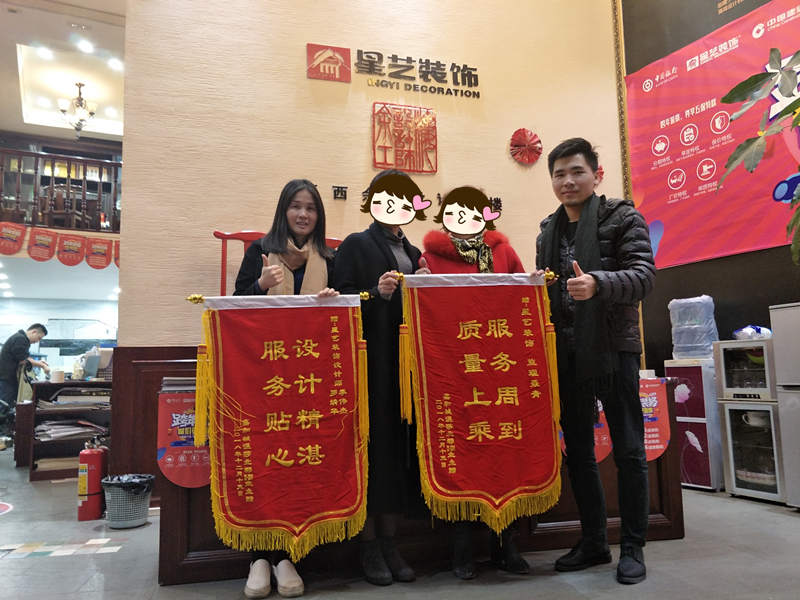 2018年12月15日下午,兩位選擇星藝裝飾裝修的嘉和城溫莎北郡業主送來錦旗兩幅,稱贊設計師羅靖華,李偉杰,監理聶青服務貼心 設計精湛 質量上乘 服務周到。