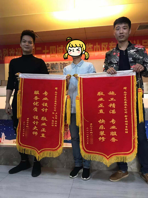 2018年12月21日,榮和千千樹業(yè)主送來錦旗,稱贊設(shè)計(jì)師陸飛、盧永琦專業(yè)設(shè)計(jì),敬業(yè)正直,服務(wù)優(yōu)質(zhì),設(shè)計(jì)大師;監(jiān)理余子林施工精湛,專業(yè)服務(wù),敬業(yè)正直,快樂裝修。