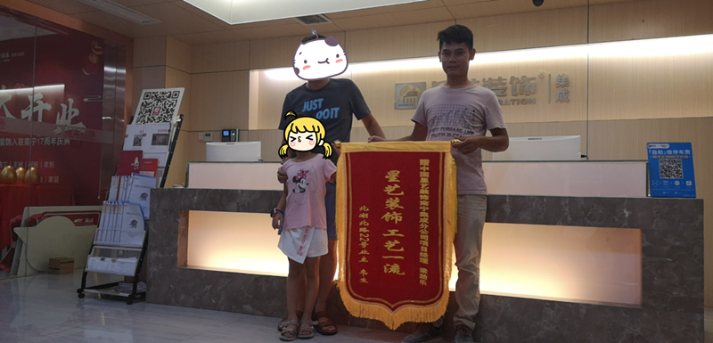 北湖北路業(yè)主送來(lái)錦旗,星藝裝飾項(xiàng)目經(jīng)理梁勁樂(lè) 接受錦旗,錦旗內(nèi)容:星藝裝飾工藝一流