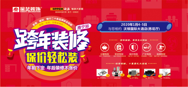 材料環(huán)保/運輸政策嚴格管控,材料上漲、人工上漲導致裝修成本年年高。為減少業(yè)主裝修煩腦,回饋廣大新老客戶,按集團總部統(tǒng)一部署,舉行2019年“跨年裝修.保價輕松裝”全國跨年鉅惠大聯(lián)動活動,給八桂裝修業(yè)主帶來一場保質更保價的高品質家裝盛會。本次活動聯(lián)合中國銀行、建設銀行以及眾多一線建材品牌歲未大促銷。星藝特別承諾:活動下定,2020年裝修享2019年單價等十重好禮鉅惠,具體優(yōu)惠細則如下: