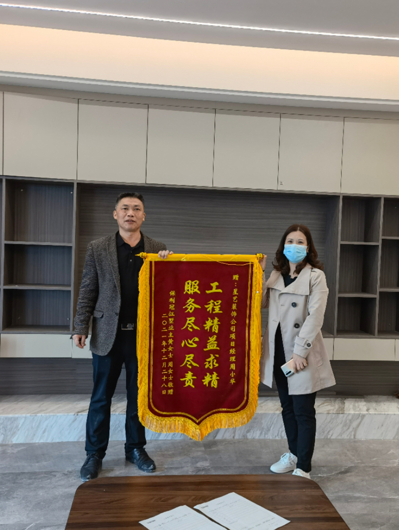 2022年元旦過后,來自保利冠江墅業主將一面印有“工藝精益求精,服務盡心盡責”的大紅錦旗送到星藝裝飾,以感謝星藝裝飾的裝修質量和服務。