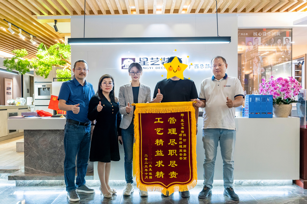 在星藝裝飾廣西總部,我們收到了一面由業主送來的錦旗,上面寫著“工藝精益求精 管理盡職盡責”。這是對我們工作的肯定,也是對我們團隊精神的認可。