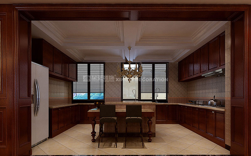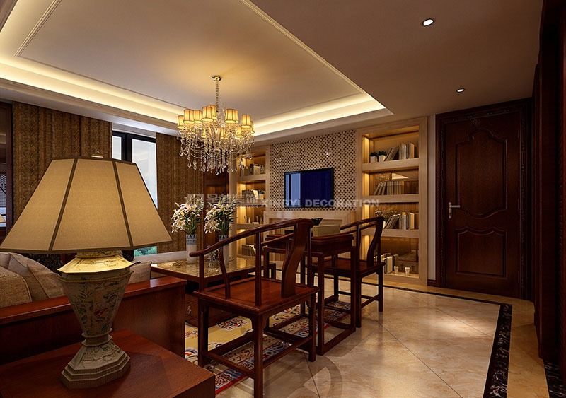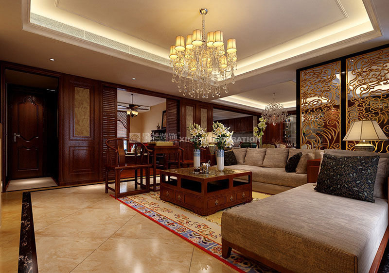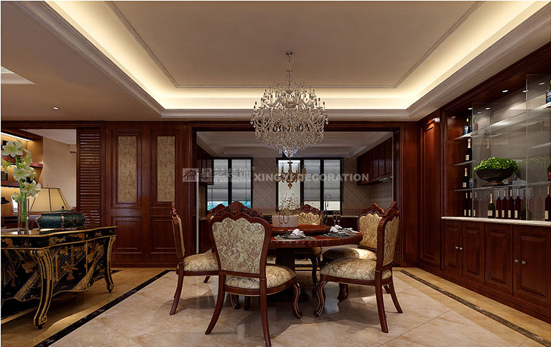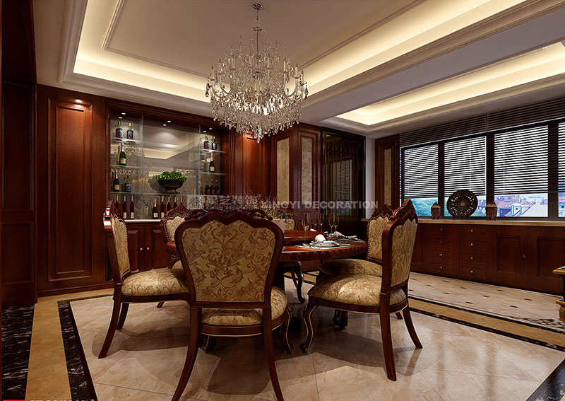 地面采用石材拼花,用石材天然的紋理和自然的色彩來修飾人工的痕跡。使客廳和餐廳的那種奢華、檔次和品位毫無保留地流淌。 在家具配置上,多選用板木結合的實木家具,家具漆面具有封閉漆效果,不僅能將木皮的紋理盡情展示,在徒手觸摸時,還能感受到油漆飾面后的光滑、平整。