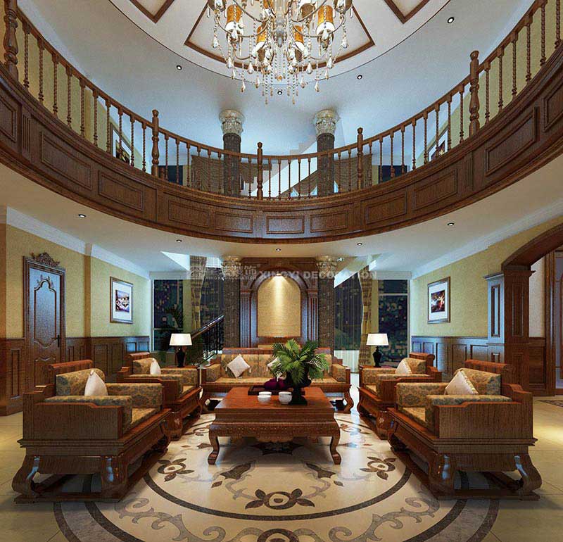 回歸生活的最初點,本案采用現(xiàn)代的設(shè)計手法闡釋古典美式,在原有傳統(tǒng)美式的住宅空間格局下,配置有中國傳統(tǒng)的中式家具,賦予室內(nèi)中西合璧生活的文化氣息。挑空圓形的大堂擺放大尺度中式紅木家具,更顯品位。