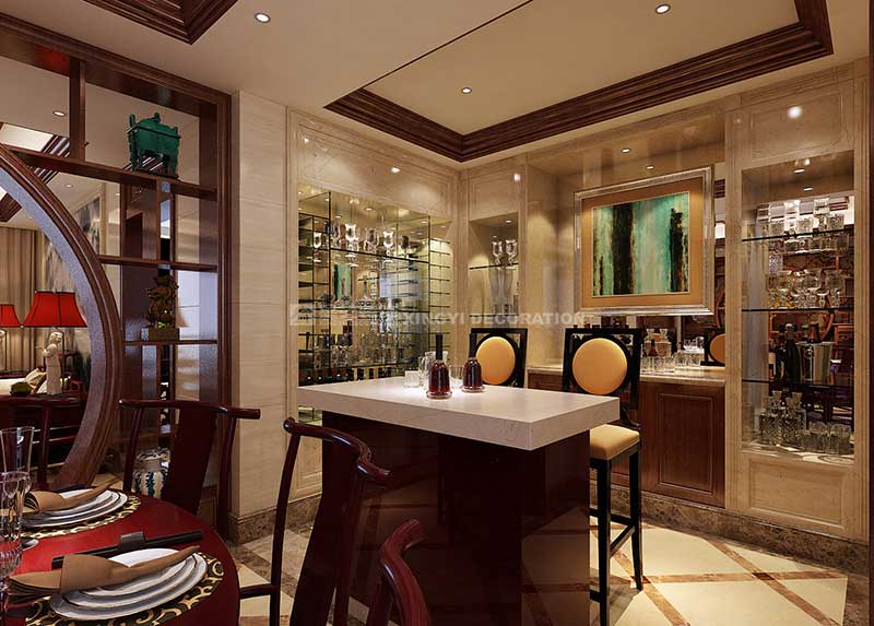 該方案最初的設計要求是中式風格,但設計師經過與客戶的多次溝通后,達成共識:要求保持中式風格的雍容華貴的氣度,但是要避免中式風格帶來的沉悶。所以一直認為要做的風格是:現代環境中具有中式元素的現代中式風格。設計過程中的重點是現代和古典如何融合以及它們各占的比例。設計師努力營造出一個開放的空間形態,讓各種設計元素(如中式韻味的花格、石材和現代的玻璃、不銹鋼等元素)都可以有機的融入進來,同時精確把握中式元素所占比例,讓中式元素成為主體,但不至于占統治地位,爭從一個全新的角度去詮釋中式風格的神韻。