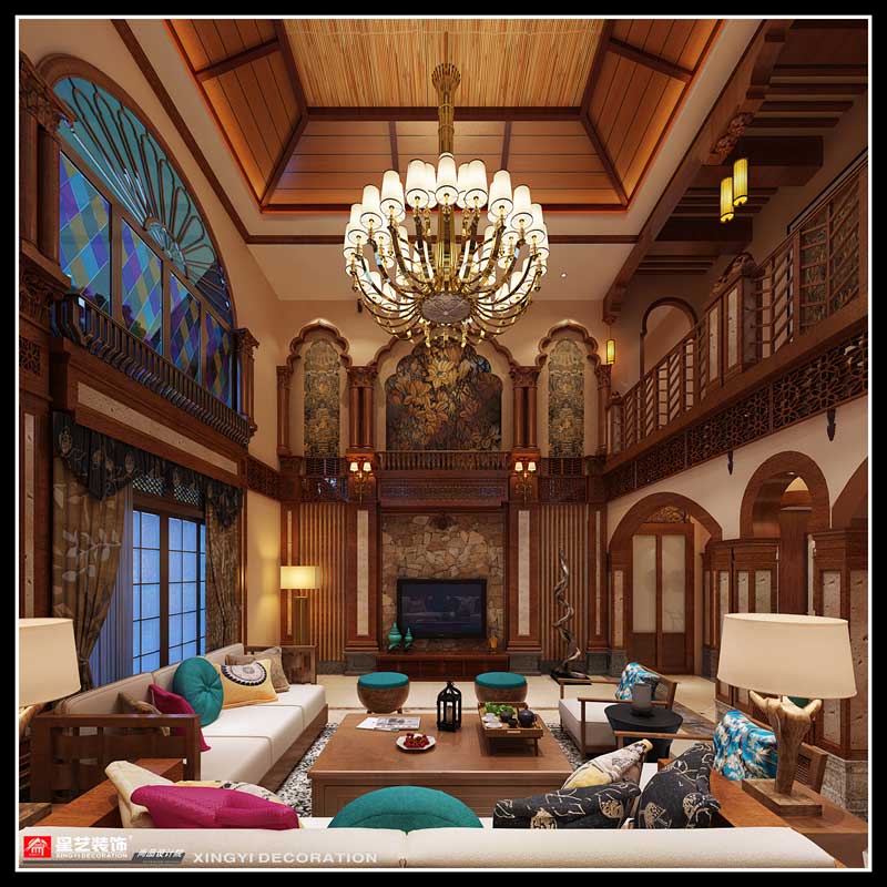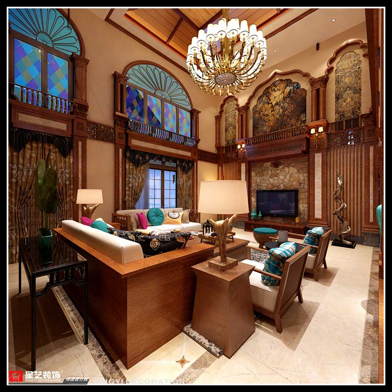 本案在東南亞風格中更偏向于家居生活化,東南亞風格講究布局上的軸線對稱、細節上多運用原木廊柱、雕花線條、金色米黃、草編等,在整個建筑空間上喜歡氣勢恢宏、豪華舒適的居住空間,給人以一種高貴典雅的感覺。