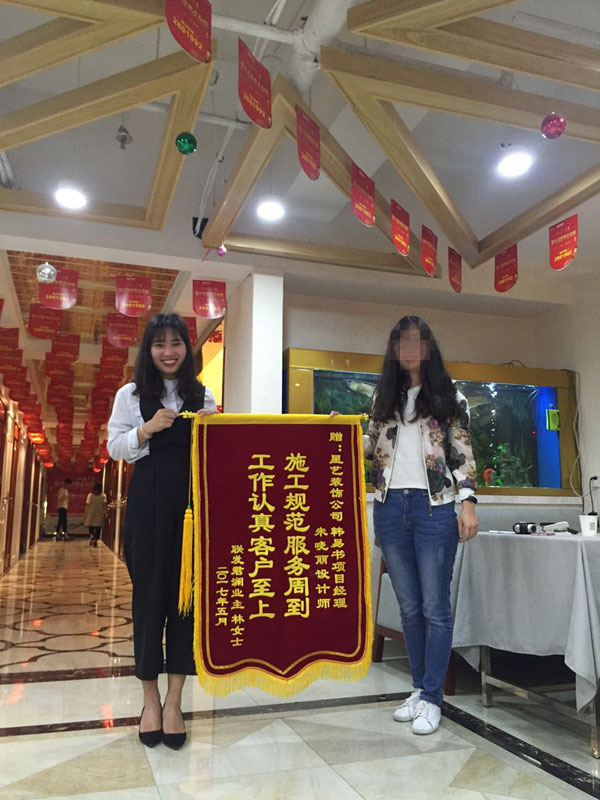 聯發君瀾業主林女士2017年5月12日送來錦旗,贊揚星藝裝飾設計師朱曉麗和項目經理韓易書工作認真、客戶至上、施工規范、服務周到。