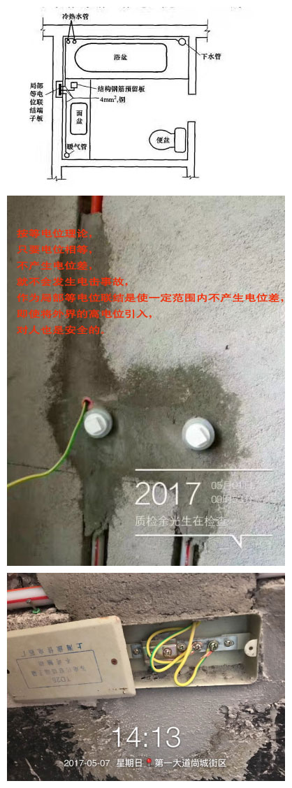 衛生間要做局部等電位連接:衛浴間濕度大,人體阻抗大大下降,漏電和沿金屬管道導入的一、二十伏電壓足以使人心室纖維顫動而死。