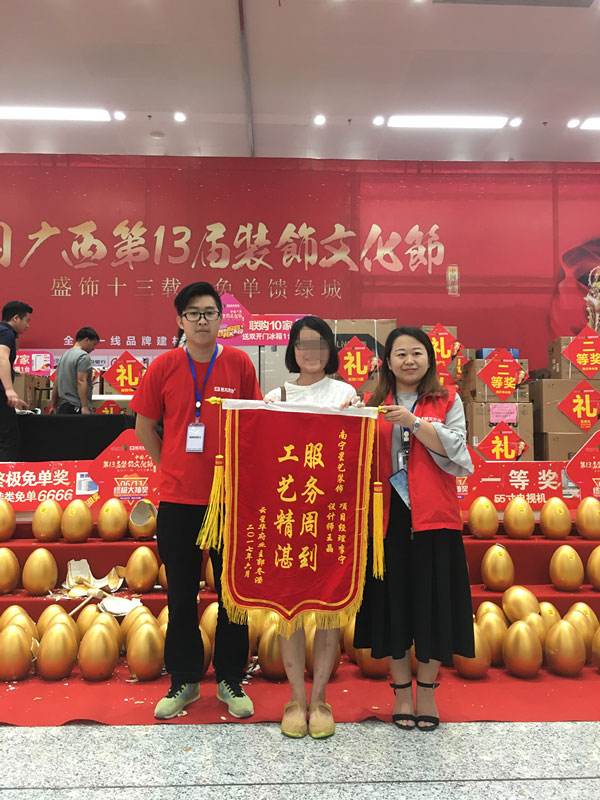 6月9日中國(guó)廣西第十三屆裝飾文化節(jié)(南寧站)現(xiàn)場(chǎng)云星華府業(yè)主送來(lái)錦旗,感謝設(shè)計(jì)師項(xiàng)目經(jīng)理,工藝精湛,服務(wù)周到。
