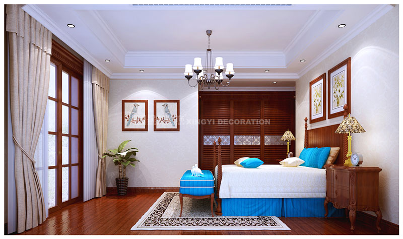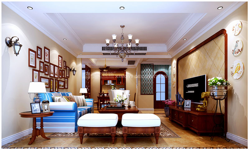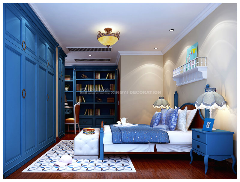 本案以標志性的地中海藍作為設計主調,配合自然的實木色調,摒棄繁瑣和奢華,將鄉村風格的優秀元素融合匯集,以自然為主基調,使家變得更輕松、舒適。不論是客廳沙發上的一抹藍,還是臥室衣柜的一片藍,都能讓人聯想起地中海那湛藍的海水和清澈的天空。