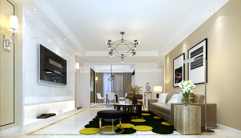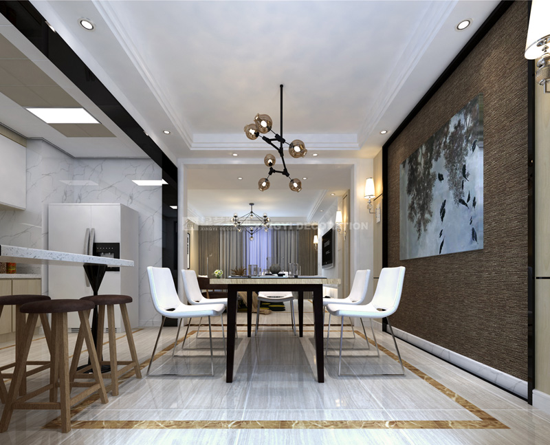 隨著都市面貌的日益更新,時尚名品充滿人們的視野,越來越多新興的精英人群,追求時尚生活的唯美男女,已通過他們前衛的思想,優雅的舉止,不浮夸不媚俗,用一種理性睿智又不失激情的生活態度詮釋著都市風的定義。此設計亦先從理性展開,客餐廳融在一個較為方正的空間里,視覺開敞明亮,通過地面材質的劃分來界定各空間并達到視覺延展。配色上,大地色的沙發與木飾,與爵士白石材相互映襯,賦予空間優雅含蓄的氣質。粗細有致,克制應用的金屬線條,通過豎橫有序的伸展,“構成”出藝術品味。木和石材的寬窄分割與斜向鋪陳,“不羈”出與眾不同。