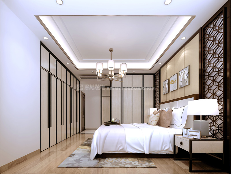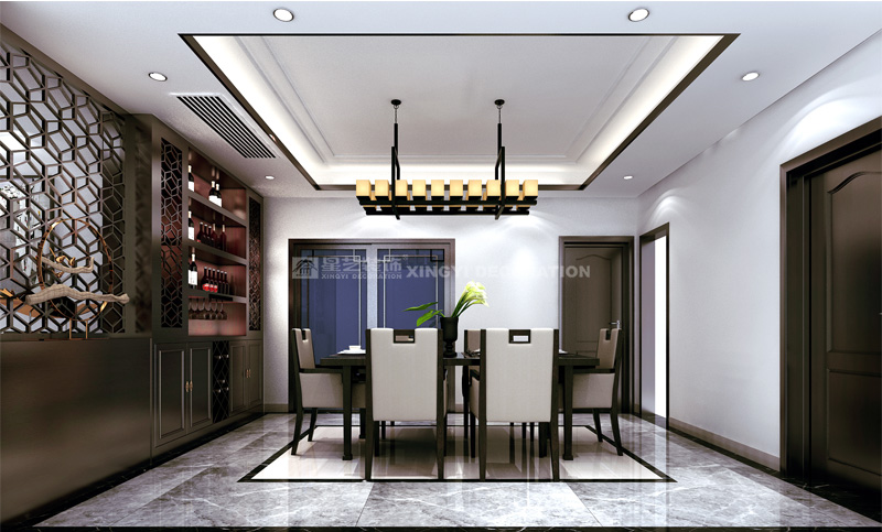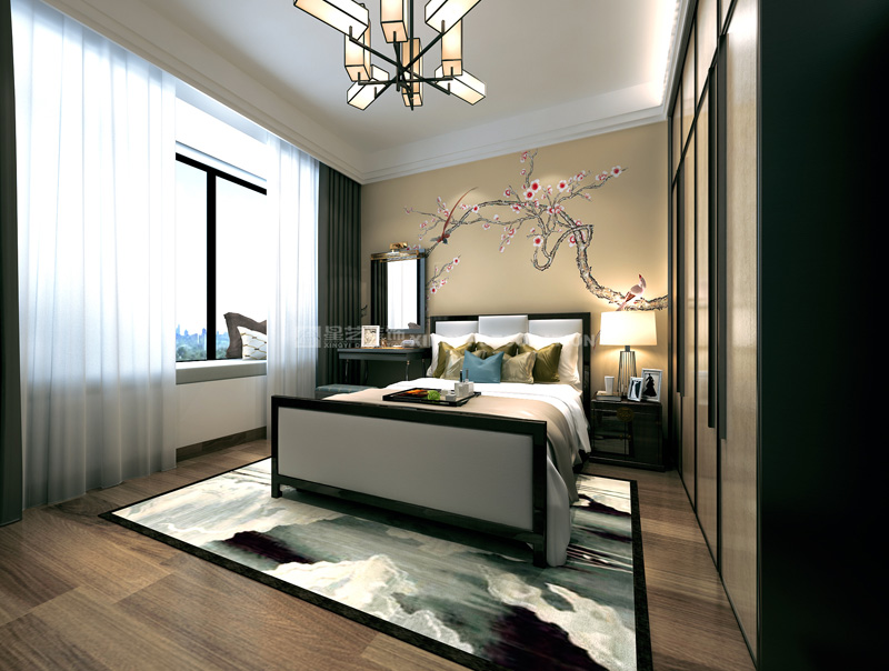 本案現代中式風格中透露出一種雅的意境,注重身心感受的這種情懷。它提取了中式風格中的代表性元素結合現代質感,在顏色、尺度、物料的重組中將中式風格賦予現代氣息整體色調以儒雅內涵的胡桃木色為主調,搭配湖藍與湖綠,以色彩表現悠然的東方意蘊。新的家具傳統的意像,地毯意像圖騰的視覺再造新空間,東方文化的美感融入現代生活。中式最講究和諧,所選擺設中有東方插花和中式元素擺件,處處透露出詩意的意境