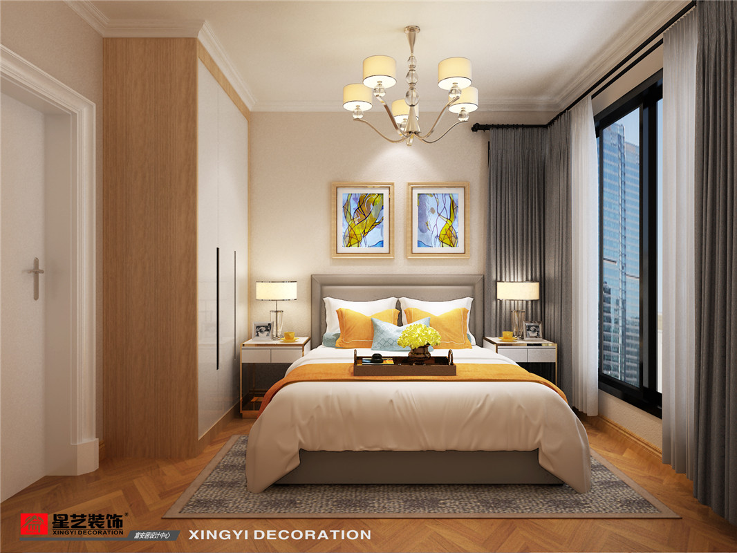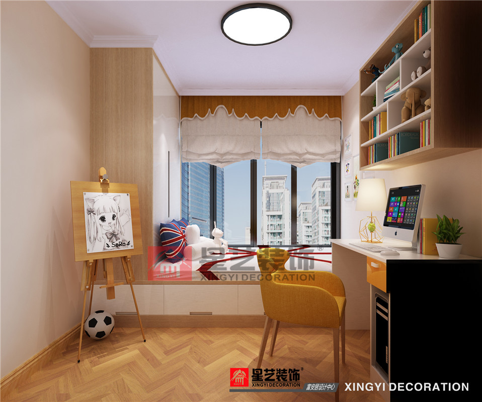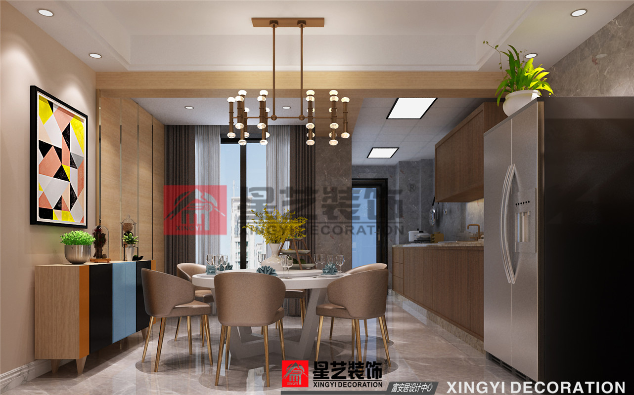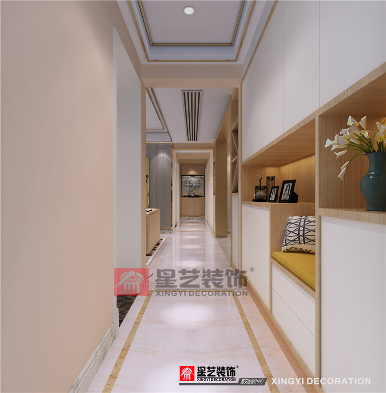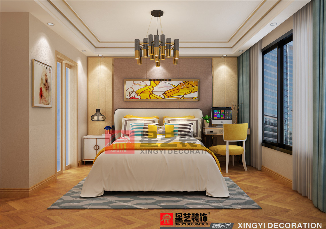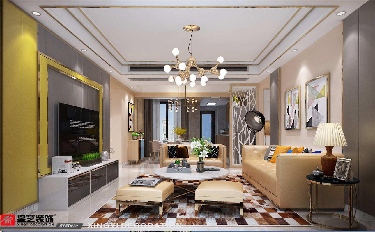 南寧星藝裝飾設計師專業設計的榮和千千樹133平現代簡約裝修案例,以定制硬包為主。亮黃色的硬包,搭配同色系的皮質沙發,及頂面的香檳色的不銹鋼線條,強調了空間的亮面。使整個空間低調又不失內涵。