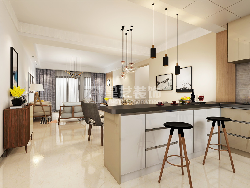 我們去現場看過以后,現場客餐廳的采光不是很好,格局的改動不會很大,我們把入戶進來的墻體打掉做了開放式的廚房,U字型的櫥柜加吧臺使廚房整體的空間格局更加實用,同時光線也解決了光線不好導致廚房餐廳過于太暗的問題,因為考慮業主喜歡中式家具,但是又要現代簡約風格,我們考慮用暖色系的瓷磚、墻面飾面板和淺色系硅藻泥的機理來吧客戶后期買回來中式家具給顯襯出來,使整體空間看上去不會因為中式家具的獨特而格格不入,更加舒適。