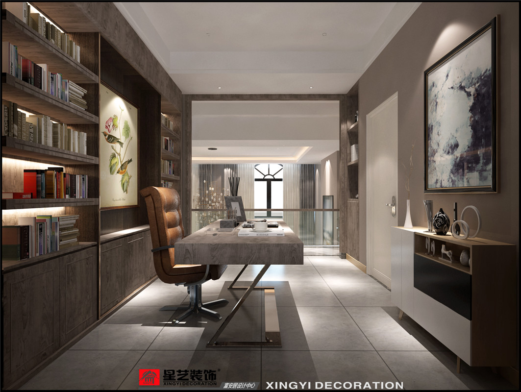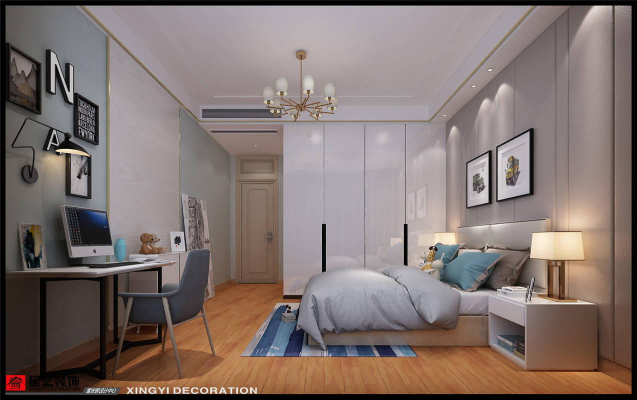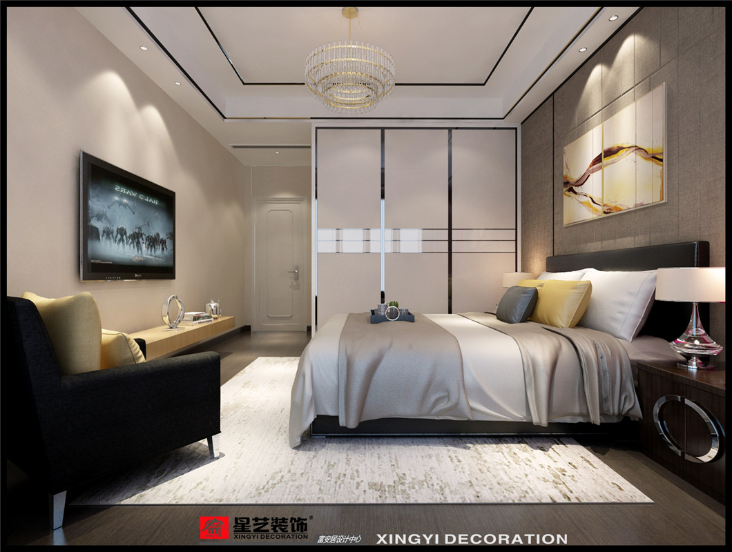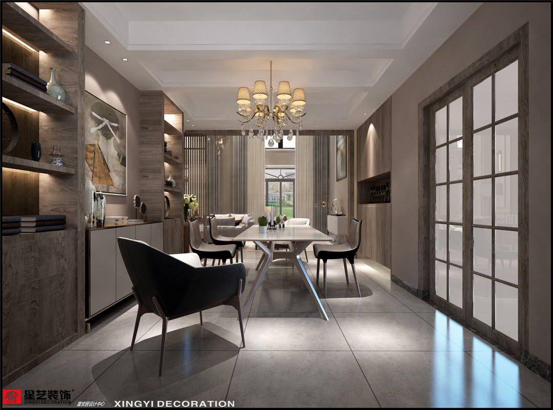 在裝飾效果中我們我們去繁就簡,沒有選擇用太多繁瑣的線條去給家進行修飾。灰色的護墻板和山水畫式的大理石瓷磚及大理石的線條做客廳背景墻造型,體現出男主人家的不“俗”品味。整體灰色的格調通過燈光的渲染體現出空間里地面、墻面、天畫面不同的層次感。