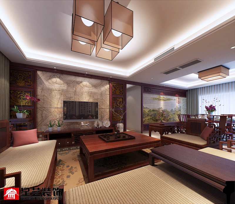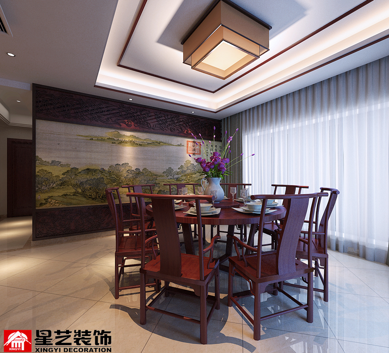 南寧星藝裝飾馬瓏萍設計師專業設計的保利大都郡110平中式風格裝修案例,這是一名老客戶介紹的朋友,房子買的是精裝房,在工程項目中,增添木工柜子以及裝飾背景墻,業主偏愛紅木家具,所以裝修風格定位為中式風格,圍繞家具濃重的中式味道的雕刻,我在裝飾背景墻面做了呼應的設計,電視背景墻木飾面對稱處設計八個有吉祥寓意的定制雕花,噴上金漆,突顯華貴,搭配大氣的大理石瓷磚相襯,沙發背景墻優美古詩,餐廳清明河上圖壁畫體現的繁華景象,古香古色賦予情懷。