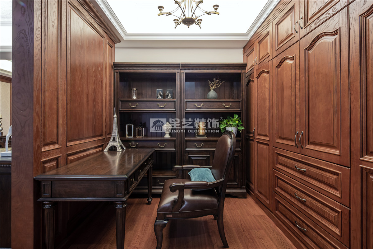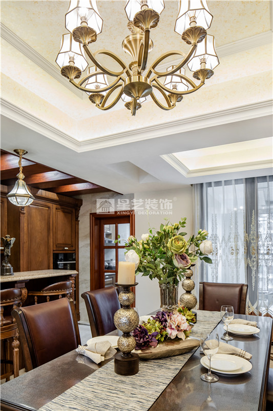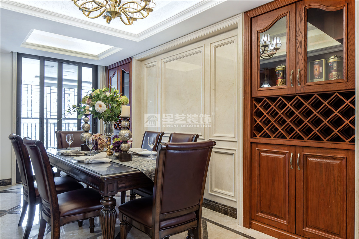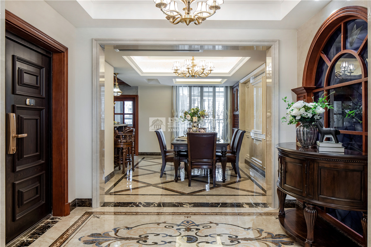 這套案列客廳選用暖色為主色彩。充溢美式元素的客廳吊頂讓空間顯得愈加華貴。玄關處采用彩色玻璃屏風以及地面的拼花使得空間更絢麗多彩。門套線選用的石材與客餐廳的背景墻相呼應,使得整個空間何諧上檔次。
