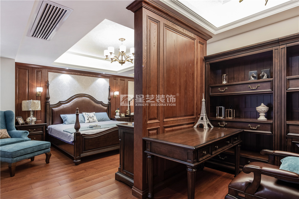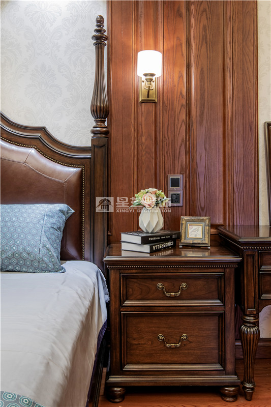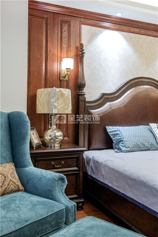 臥室安頓較為溫馨,作為主人的私密空間,首要以功用性和有用舒暢為考慮的要點,通常的臥室不設頂燈或者是床尾有吊燈,多用溫馨柔軟的成套布藝來裝點,一同在軟裝和用色上十分一致。