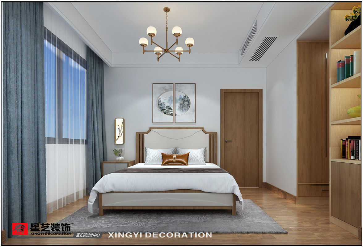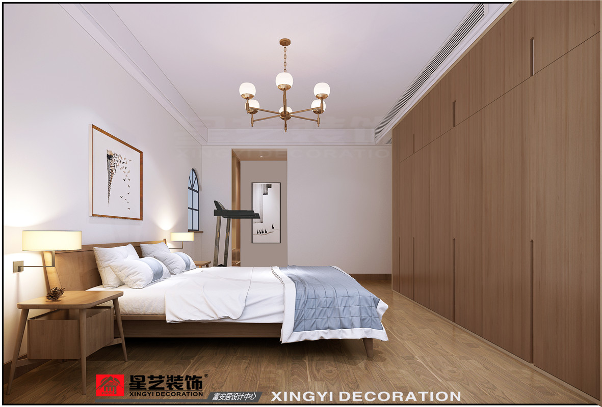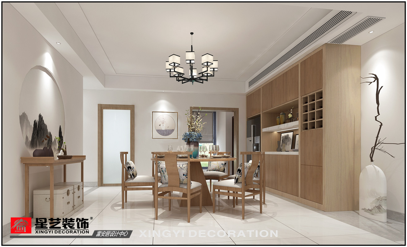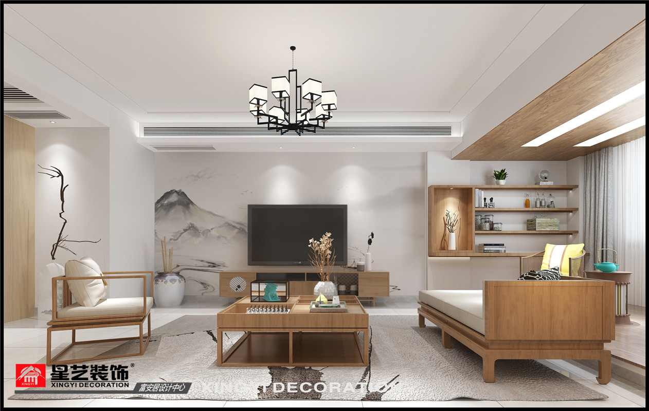房子為一家五口人居住,業主夫妻二人,一個女兒以及兩位老人共同居住。業主喜歡原木色,希望家里面更清新自然,喜歡中式的感覺但是不希望家里用色太沉重,以清爽明亮為主。最后設計定稿為淺色調的新中式風。立面沒有過多裝飾,以墻布為主要裝飾材質,大面積的山水意境圖墻布搭配大面積的白色墻面,簡約又不失中式意境。