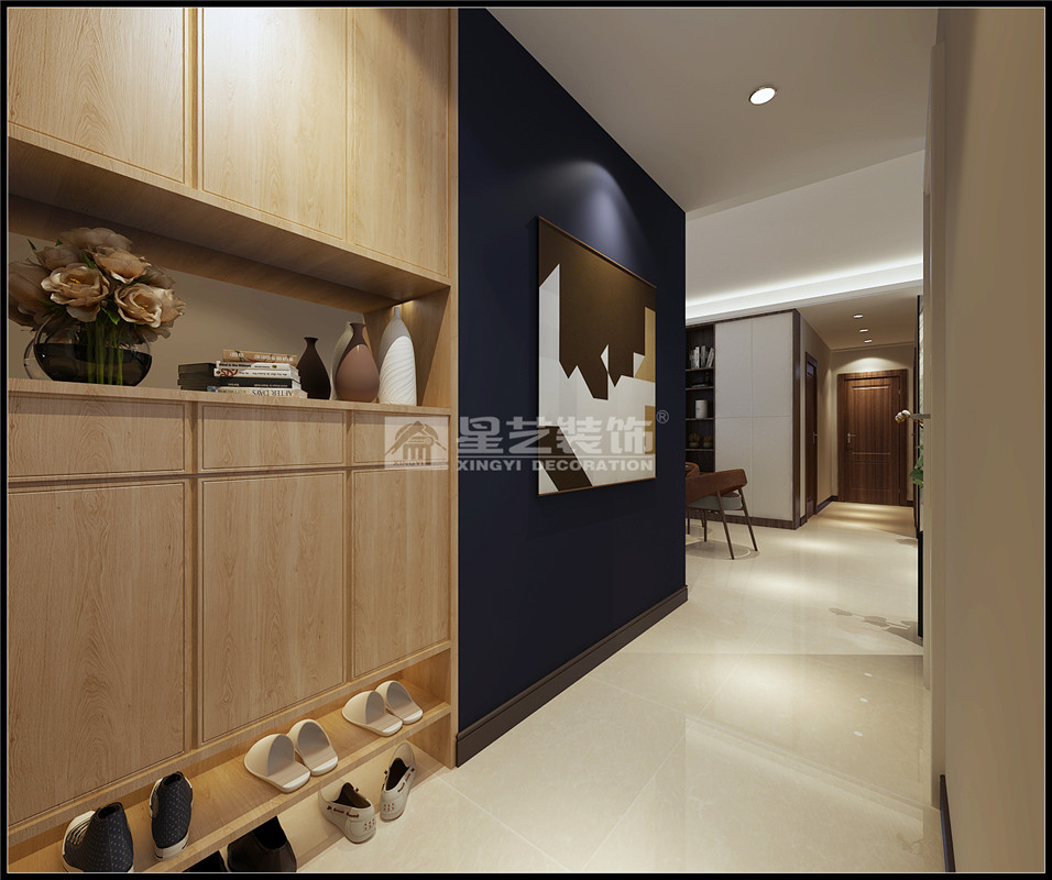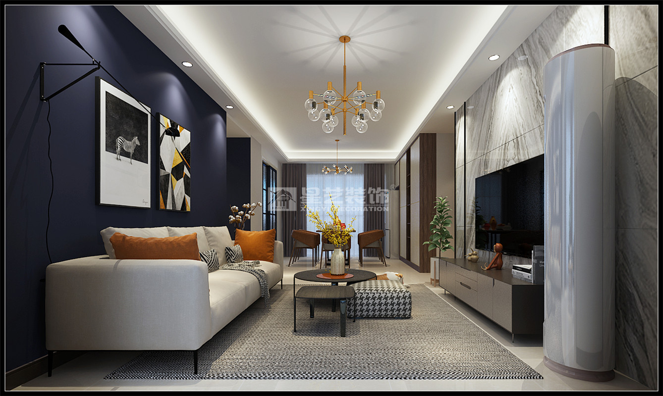 你的居所如你一樣,冷淡之外帶著溫馨。藍色、石材、黑鈦鋼為冷系,橙色、木質、棉麻為暖系,冷暖搭配整體設計表達個性的同時兼具溫馨感