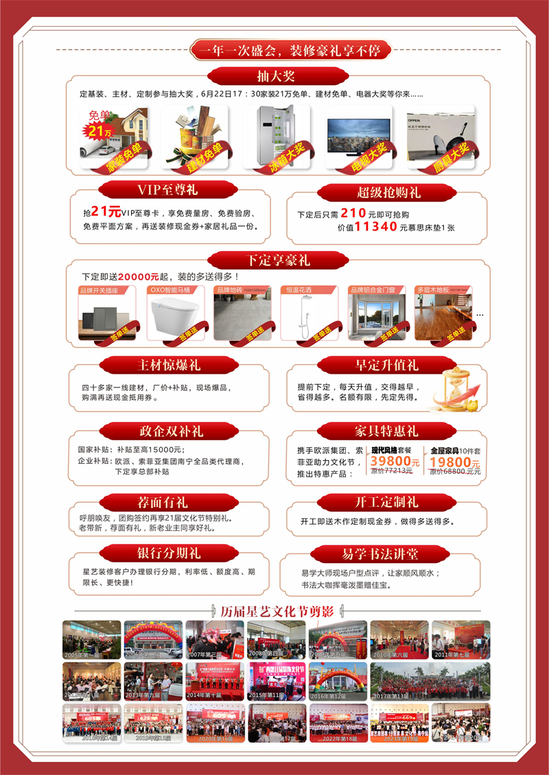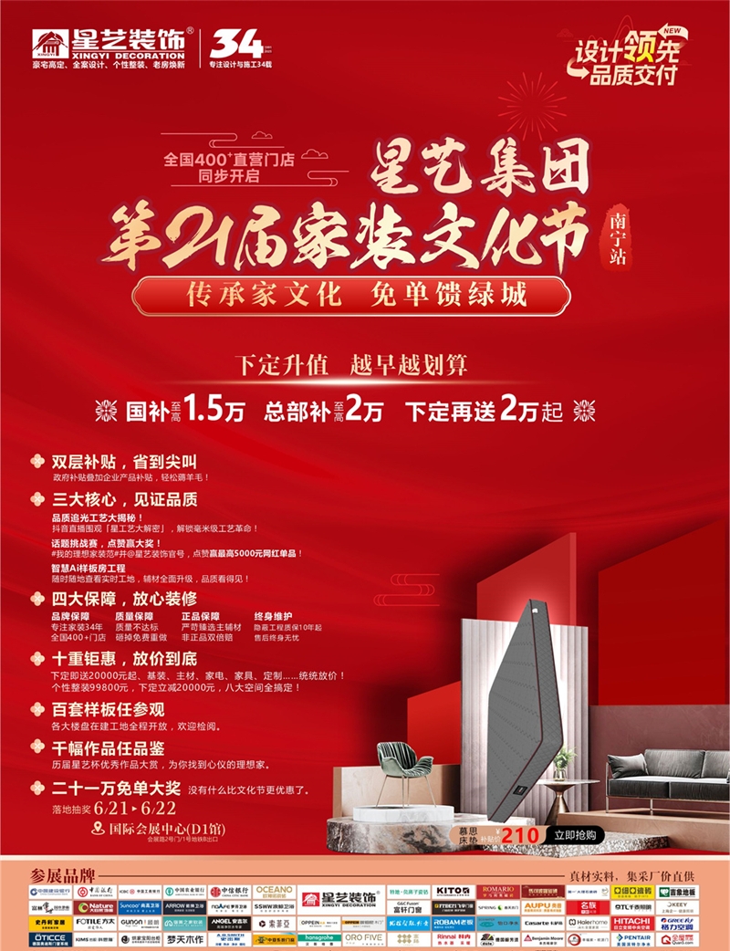 2025年中國星藝第21屆家裝文化節,全國400多家直營門店聯動,年度巔峰讓利,搶2億裝修豪禮,讓幸福啟程。星藝人將以最專業的團隊,最經典的設計,最貼心的服務、最堅實的品質、最期待的鉅惠,將一場裝飾文化盛宴,獻禮綠城,具體優惠如下: