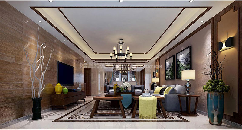 此戶型為6房2廳的結構,其中5間主人的房間都有獨立的衛生間,使得日常生活使用非常的方便??蛷d、餐廳的面積比較大,設計師通過1米高的白墻和中式隔斷巧妙把它們分割開來,但從視線和空間效果來看它們又是緊密聯系在一起的,達到了“隔而不斷”、又有中式園林中“借景”的效果。電視背景墻采用個性化的復合木地板上墻,簡潔大方,通過隱形門的設計巧妙的把多功能房的門修飾起來。餐廳設置有一個吧臺區域,既使用又美觀。業主不喜歡太繁瑣的裝飾,所以每一個臥室都沒有按常規設計背景墻,只是通過吊頂造型和墻面顏色營造不同的氛圍。